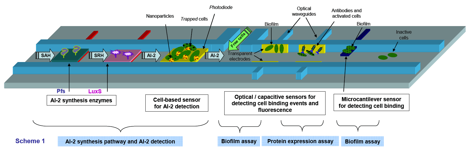 Figure 1 shows our concept for reconstructing the native AI-2 biosynthetic pathway in MEMS; entrapping "rewired" reporter cells that detect the functioning pathway; and studying the altered phenotype of the "guided" cells. A key aspect of our approach is that we can visualize individual cells that respond to different genetic outcomes (in the center chamber). We can do this by measuring green fluorescence emitted from individual cells. These cells respond to AI-2 and make green fluorescent protein (GFP), which is a reporter of a greater set of genes that are simultaneously upregulated. These genes (e.g., yadN, yadK, b0942, flu) facilitate cell attachment to surfaces and are the basis for biofilm formation. When we see a bright green cell, we should expect that individual cell to be "ready" to establish a biofilm. We can magnetically release all cells, and in the next chamber, capture the "ready" cells using a generic antibody-based capture system. The cells that are not green, should not have surface appendages, and should pass by. Then, we can measure the growth of the biofilm by capacitance, resistance, and by optical measurement, all at the same time. Our reusable MEMS technology allows us to then dry the film, remove it, and correlate it with the gold standard crystal violet assay that is accepted by the biological community. As a result, the measurements that are obtained on-chip can be cross-validated with biological experiments that are not from devices.